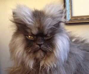 Owners Anne Marie Avey and Eric Rosario, of Los Angeles, say the 2-year-old cat got its name because of his epic frown and fur. It takes both of them to brush the cat’s fur three times a week.