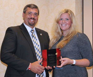 Pacesetter – Mid-Plains Community College President Ryan Purdy receives the Pacesetter of the Year award from Erin Edlund, director of the National Council for Marketing and Public Relations District 5, during the district’s annual conference in Kansas City, Mo. on Oct. 2.